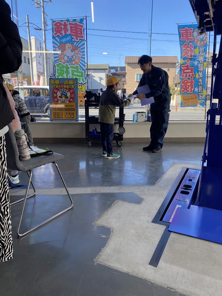 実際の整備工場の見学、タイヤの空気入れやウォッシャー液の補充など、